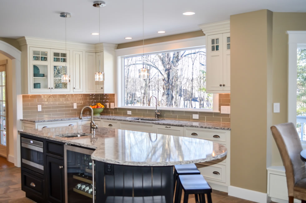 One of the most striking elements of the Great Bay Kitchen is its backsplash. A combination of subway tiles and mosaic patterns behind the stove creates a visual centerpiece that draws the eye. The glossy finish of the glass tile reflects light beautifully, enhancing the kitchen’s bright and inviting atmosphere. This meticulous attention to detail in the backsplash design adds texture and interest, perfectly complementing the understated elegance of the overall space.